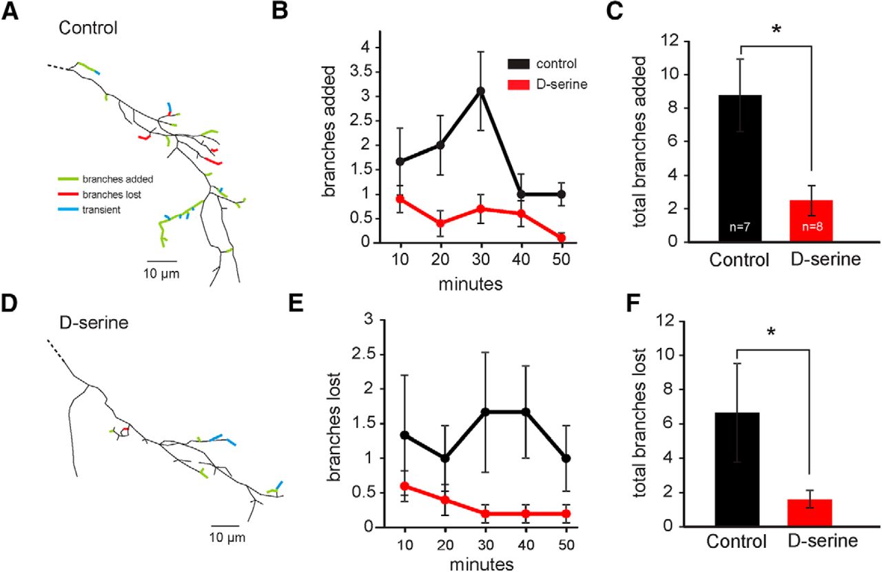 D-Serine results in hyperstabilization of axonal arbors. Branch dynamics measured by short-interval in vivo time-lapse imaging of RGC axonal arbors in the tectum. Example reconstructions of RGC axons imaged every 10 min for 1 h from (A) a control animal and (D) an animal exposed for 48 h to d-serine show branches that were added (green) or lost (red). Transient branches (blue) were added and lost during the 1 h imaging session. The average number of branches (B, C) added and (E, F) lost every 10 min from control animals (black, n = 7) and animals exposed to d-serine for 24â48 h (red, n = 8). *p < 0.05 (Student's t test).