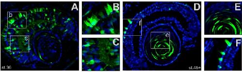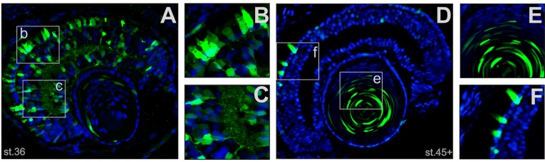 (D–F) stage 45+. Nuclei are counterstained with DAPI. (A–C) A DEVD transgenic embryo at stage 36 showed consistent GFP signals in all retinal layers