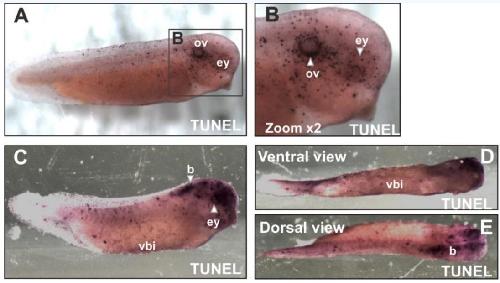 (VBI). (A-B) Stage 32-34 embryo revealed a great number of apoptotic cells at the otic vesicle (ov) and eye (ey). No TUNEL-positivity was seen at the VBI. (C-E) Stage 32-34 embryo showed also apoptotic cells in the brain area (b) (clearly visible on the dorsal view in (E)). Again no apoptotic cells were present at the VBI (see ventral view in (D)).