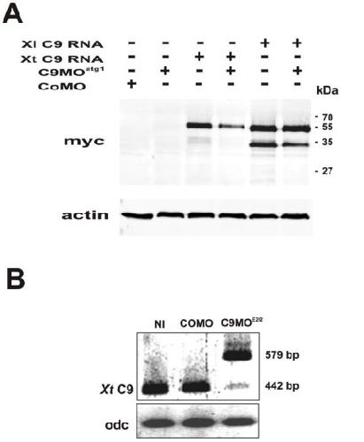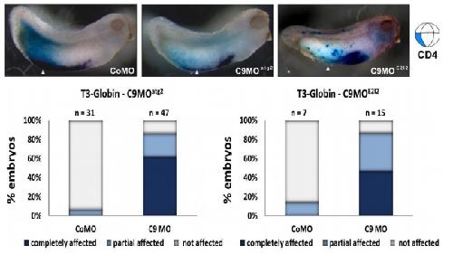 stage with 2.5 ng C9MOatg1, 4 ng CoMO or a combination of 2 ng C3MOatg and 2 ng C7MOatg in each blastomere. β-Gal RNA (10 pg) was coinjected as lineage