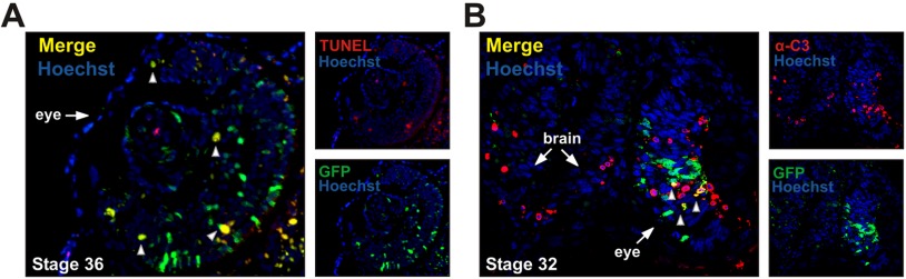 (B) 32, when massive cell death is occurring in the developing retina (X. tropicalis). Arrowheads indicate GFP-positive retinal cells colocalizing with TUNEL-positive