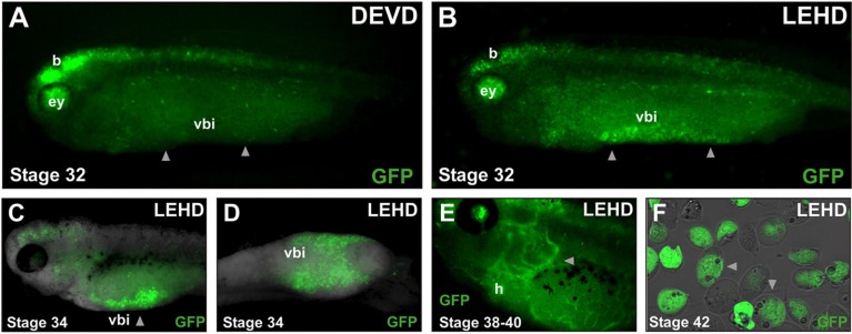 Fig. 5. Activation of the LEHD reporter in the VBI. (A,B) Comparison between the transgenic DEVD and LEHD reporter embryos (X. tropicalis) revealed