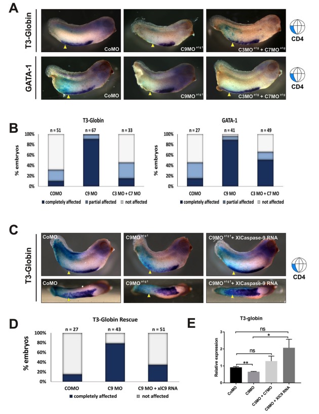 tracer. WISH analysis of T3 globin and gata1 expression in the posterior part of the VBI is shown. Both T3 globin and gata1 expression were affected upon depletion of casp9, but not upon the combined depletion of casp3 and casp7. (B) Graphs representing the percentage of embryos injected in CD4 blastomeres at 16-cell