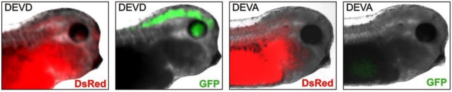 transgenic DEVA reporter embryos failed to generate a GFP signal despite strong DsRed expression.