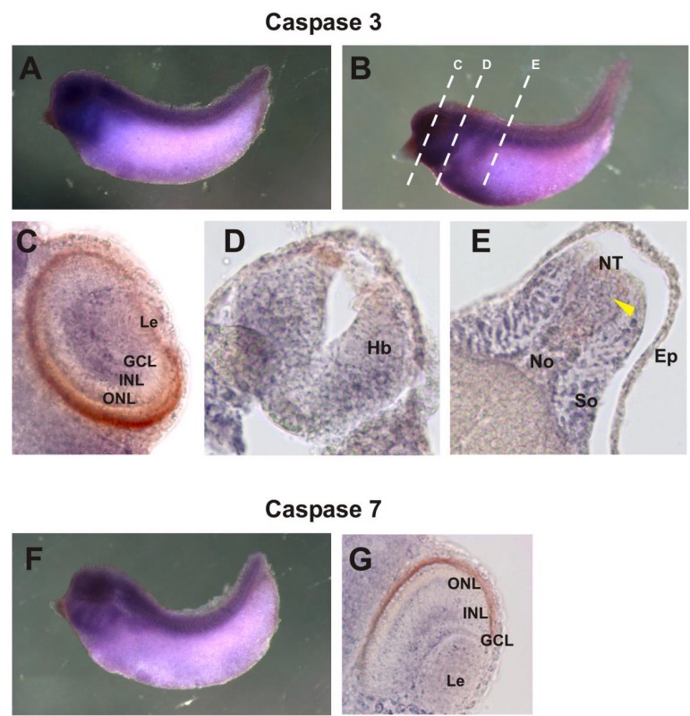 Figure S3. Caspase-3 and caspase-7 are ubiquitously expressed in early tadpole stages. Expression of caspase-3 (panels A-E) and caspase-7 (panels F,G) mRNA as revealed by whole mount in situ hybridization. Expression is shown for stage 32 (panels A,F) or stage 36 (panels B-E and G). Panels CE and G show mRNA expression in vibratome sections. (C and G) Expression in the eye is detectable in the lens (Le) and the outer nuclear layer (ONL), the inner nuclear layer (INL) and the ganglion cell layer (GCL) of the retina. (D) Expression of caspase-3 mRNA in the hindbrain. (E) Expression of caspase-3 mRNA in the trunk region including the epidermis (Ep), the neural tube (NT), the notochord (No) and the somites (So).