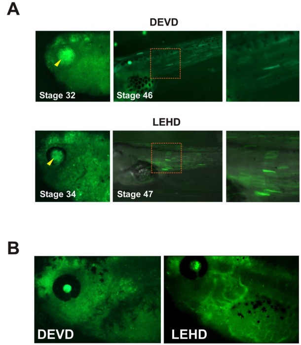 Figure S4. Similarities and differences in GFP patterns in transgenic DEVD- and LEHD-reporter tadpoles. (A) DEVD- and LEHD-reporter activity is present in the lens and the muscle, consistent with possible non-apoptotic caspase activity. Both the DEVD- (top) and the LEHD-reporter (bottom) reveal GFP expression in the cells forming the lens around stage 32-34 (left pictures, yellow arrowhead) and in individual myocytes in the late tadpole tail (middle pictures, with the boxed area enlarged in the right pictures). (B) Circulating GFP-positive blood cells are only present in LEHD reporter tadpoles. Tadpoles of DEVD-reporter (left) or LEHD-reporter (right) are shown around Nieuwkoop stage 39. GFP signal in the vasculature is due to circulating GFP-positive blood cells. No such activity is present in the DEVD reporter despite high transgene expression.