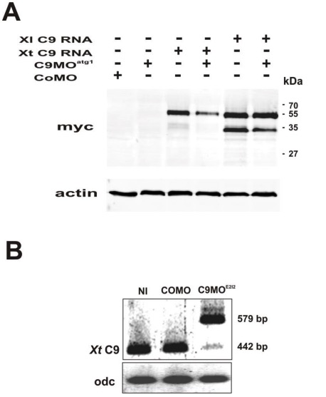 Figure S5. Validation of Morpholino injections. (A) C9MOatg1 does not target Xenopus laevis casp9 RNA. Western blot analysis of exogenous casp9 levels after depletion with the translation blocking morpholino C9MOatg1. Embryos were injected at 2-cell stage with 10 ng C9MOatg1 and 10 ng CoMO alone or combined with 250 pg RNA coding for Xenopus laevis casp9 (Myc-tagged) or Xenopus tropicalis casp9 (Myc-tagged). The functionality of C9MOatg1 was proven by the clear reduction in Xtcasp9 protein levels upon depletion while the four mismatches in the morpholino target sequence of the Xlcasp9 mRNA seem to be sufficient for blocking the binding with the morpholino and make the Xlcasp9 transcripts suited for rescue experiments. (B) Splice blocking morpholino C9MOE2I2