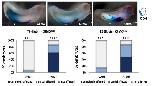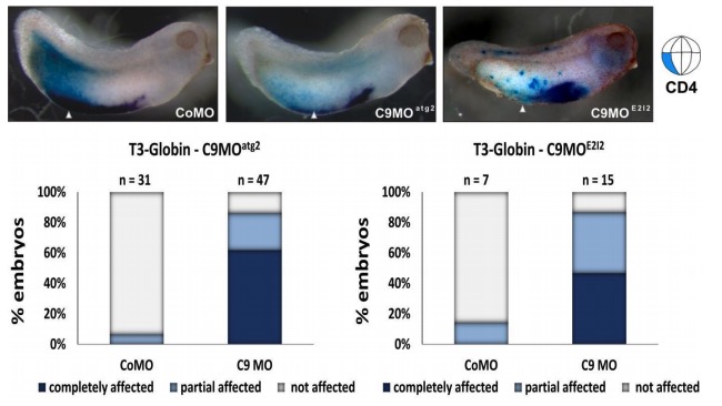 Figure S8. Confirmation of specific depletion of the primitive blood markers with additional casp9 morpholinos (C9MOatg2 and C9MOE2I2). Embryos were injected in the two CD4 blastomeres at 16-cell stage with 3.5 ng C9MOatg2, 4 ng C9MOE2I2 or 4 ng CoMO in each blastomere. RNA of cytoplasmic β-Gal (10 pg) was coinjected as lineage tracer. Whole mount in situ hybridization analysis of T3 globin expression in the posterior part of the VBI (arrowheads). T3-globin expression was affected upon depletion of casp9 with these additional morpholinos. Graphs represents the percentage of embryos exposing the defect in the observed marker expression.