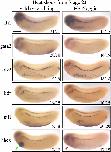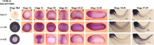 Fig. S1. BMP type II receptors. Type II receptors complement type I receptors and can potentially interact with any type I receptor with ligands being the determinant of the nature of heterocomplexes. Bmpr2 is not expressed at gastrulation, but its expression is activated in the ventral mesoderm from stage 16, later extending to almost all tissues. At stages 34â39, Bmpr2 is also expressed in the DA. Acvr2a is expressed ubiquitously at all stages analyzed. Acvr2b is expressed ubiquitously at gastrulation but later display a restricted expression pattern, being expressed predominantly in neurons. Acvr2b is localized to DA at stage 39. Embryos at stages 10.5 and 34â39 are cleared to enable visualization of the staining in deeper tissues. For stage 10.5 embryos, D indicates dorsal and V indicates the ventral side. For stages 16â20, embryos are visualized from dorsal (D) and ventral (V) angles, with anterior (A) at the top, except stage 16 bmp4 staining, which is documented from an anteriorâposterior (A-P) lateral view. From stage 21 onward, the pictures of embryos are taken from a lateral view, with anterior-posterior labeled where it is relevant, on the figure. |