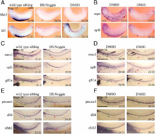 Fig. 2. BMP signaling is required for definitive and primitive hematopoiesis in Xenopus laevis. (A) Noggin protein induced by heat-shock treatment at stage 14 leads to a complete loss of tal1 and hba3 expression in ventral blood islands (arrows) in HS:Noggin transgenic Xenopus stage 32 embryos. Similarly, DMH1 treatment starting from stage 14 blocks tal1 and hba3 expression. (B) Inhibition of BMP signaling by DMH1 from stage 14 abrogates expression of myeloid blood markers mpo and spib at stage 33 compared with DMSO-treated control. (C and D) Inhibition of BMP signaling from stage 14 by Noggin (C) or DMH1 (D) results in the loss of expression of hemogenic endothelium markers runx1, spib, and gfi1a in the DA (red arrow for absence of in treated, green arrows for normal expression in control embryos). (E and F) The endothelium marker pecam1 and arterial gene dll4 is expressed in control as well as treated samples, albeit slightly lower in HS:Noggin embryos. The arterial marker efnb2 is severely reduced in either HS:Noggin-expressing or DMH1-treated embryos (red arrows in E and F). The stages at which the in situ hybridization was performed are indicated on the top left corner. Embryos were photographed from a lateral view, with anterior on the left and dorsal at the top. Numbers in bottom right corner indicate proportion of embryos displaying the phenotype. (Scale bars: 0.5 mm.) |