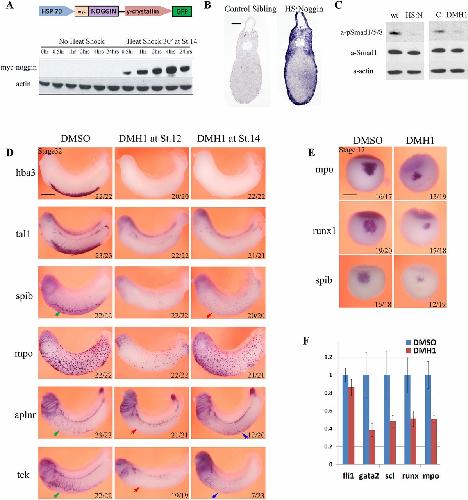 Fig. S2. Inhibition of BMP signaling by use of HS:Noggin transgenic line and chemical inhibitor DMH1 blocks embryonic myelopoiesis, erythropoiesis, and vasculogenesis. (A) Diagram showing the transgene in HS:Noggin transgenic line. A 15-min heat shock induces myc-noggin protein expression within 30 min. Noggin levels remain steady for at least 24 h after treatment. (B) In situ hybridization on sections of stage 33 embryos shows that induced noggin is expressed across the section in HS:Noggin transgenic siblings. Embryos were heat-shocked for 15 min at 35 °C at stage 32 and fixed 2 h after the heat shock treatment. (C) Inhibition of BMP signaling in heat-shocked noggin (HS:N) and DMH1-treated embryos compared to heat-shocked wild type siblings (wt) or DMSO solvent-treated controls (C) is verified by the loss of P-Smad1/5/8 signal in Western blotting. Embryos were treated from stage14, and DLPs were explanted at stage 25, about 24 h after heat shock, further confirming that noggin protein is active a day after heat shock. Smad1 staining and actin staining were used as loading controls. (D) Timing of BMP requirement in ventral blood island. Inhibition of BMP signaling by DMH1 from stage 12 leads to a strong reduction in primitive myeloid cells originating from both first (mpo, spib) and second (ventral spib staining, red arrow) waves of myelopoiesis. DMH1 treatment blocks hematopoiesis as well as endothelial development when administered from stage 12, at the end of gastrulation. Expression of erythropoiesis markers hba3 and tal1 is absent, and expression of myelopoiesis markers spib and mpo is severely reduced. Endothelial gene expression of aplnr and tek in vitelline vessels, neighboring the ventral blood island, is also absent (red arrows). Aplnr and tek are expressed in the head and the cardinal vein precursors but at a lower level. DMH1 treatment from stage14, early neurulation, eliminates erythroid gene expression, as in treatment starting from stage 12. Spib expression in the periphery of ventral blood island are also absent (red arrow) whereas patrolling myeloid cells, marked by spib and mpo, are unaffected. DMH1 treatment from stage 14 does not block aplnr expression. In 12 of 20 embryos, aplnr expression was expanded to the most ventral tissues in the territory of blood island (blue arrow). DMH1 treatment from stage 14 reduces tek expression (23 of 23 embryos), but in 7 of 23 embryos tek expression was also observed in ventral blood island (blue arrow). (E) DMH1 treatment from stage 12 blocks myeloid gene expression of mpo, spib, and runx1 in anterior hemangioblast/aVBI at stage 16. (F) qRT-PCR analysis of dissected stage 16 aVBI tissue treated with DMH1 from stage 12 shows expression of blood genes gata2, tal1/scl, runx1, and mpo are reduced in stage 16 aVBI tissue, whereas fli1 expression is normal. |