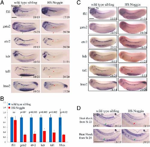 Fig. 4. BMP signaling is required for gata2 expression in the DLP transcriptional network. (A) Hematopoietic programming in the DLP, at stage 25, following heat shock-induced noggin expression at stage 15. Embryos were heat-shocked for 15 min at 35 °C at stage 15 and were collected for analysis at stage 25. Fli1 expression is unaffected in the DLP (green arrows), whereas gata2, kdr, tal1, and lmo2 expression is absent in the DLP as well as ventral blood island (VBI) (red arrows) of HS:Noggin transgenic siblings. Etv2 expression is decreased in the DLP and is absent in VBIs (red arrow). Numbers on individual images show the proportion of embryos for which that image represents (bottom right). (B) qPCR analysis of hemangioblast genes in stage 25 DLPs dissected from control and heat-shock noggin transgenic embryos. Fli1 is not significantly affected, whereas all of the other genes quantified show significant decreases of expression. (C) Hematopoietic programming in the DLP, at stage 26, following heat shock-induced noggin expression at stage 20. The expression of fli1, gata2, etv2, and lmo2 is unaffected. The expression of kdr and tal1 is reduced in the DLP hemangioblasts. HS:Noggin transgenic siblings were identified by the expression of Noggin transcripts (uniform Fast Red staining in HS:Noggin embryos). (D) Gata2 expression in the DA, at stage 36, following heat shock-induced noggin misexpression at stages 23 and 28. Gata2 expression is absent in the DA of HS:Noggin transgenic siblings when heat shock is done at stage 23 (red arrow), whereas gata2 is expressed in the DA of HS:Noggin siblings when heat shock is done at stage 28, compared with wild-type siblings (green arrows). The stage of the embryos are indicated in the top left corner of the top left image. Numbers on individual images shows the proportion of embryos that the image represents (Bottom Right). Images and numbers are from one experiment and are representative of two biological replicates. (Scale bars: 0.5 mm.) |