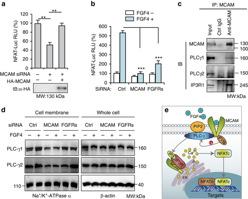 Figure 5. MCAM controls activation of NFAT.(a) NFAT-Luc reporter assay in HEK293 cells transfected together with MCAM RNAi or MCAM expression vector. RLU means relative luciferase activity. Data are presented as mean±s.e.m. (n=3). One-way ANOVA with Tukey's post-test and **P value<0.01. (b) After co-transfection of reporter plasmids and RNAi for 20 h, cells were cultured with serum-free medium overnight. NFAT-Luc activity was measured following 1 h treatment with FGF4 (2 ng/ml). No treatment served as negative control. Data are presented as mean±s.e.m. (n=3). Two-way ANOVA with Bonferroni post-test and ***P value<0.001. (c) Immunoprecipitation of MCAM followed by immunoblotting (IB). (d) PLC-γ abundance in membrane fraction of HEK293 cells and in whole cell lysate after a 48 h transfection with RNAi with or without treatment with FGF4 for 1 h. (e) Model of MCAM-controlled NFAT activation responding to FGF4. Once dimerization, MCAM conjugates FYN kinase to activate PLC-γ. |
