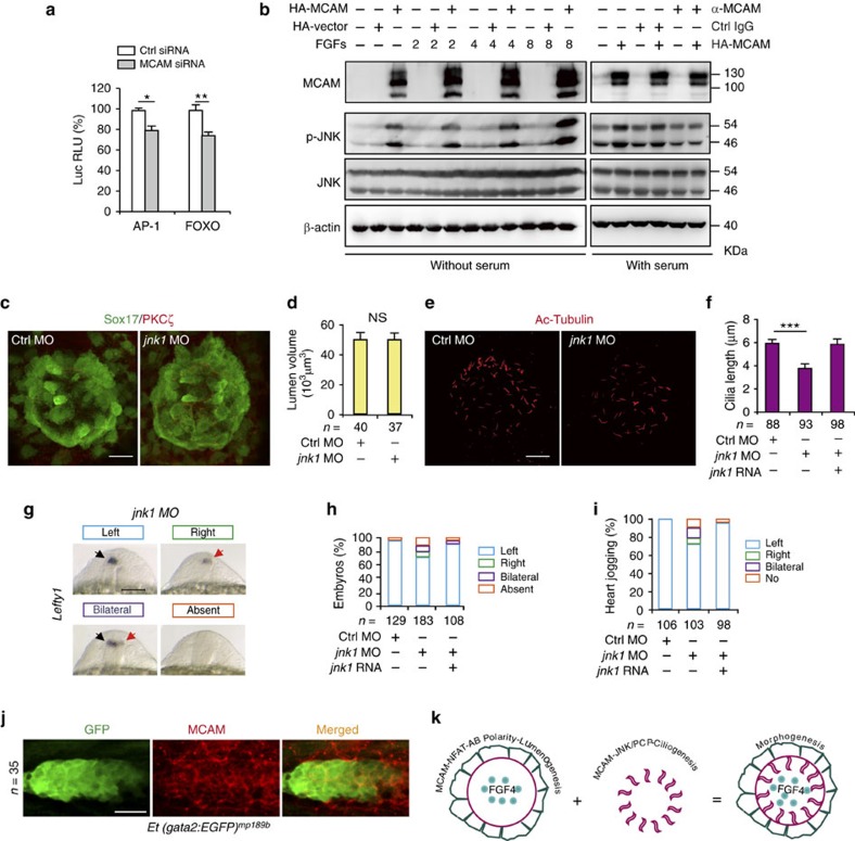 Figure 7. MCAM-dependent JNK activation regulates ciliogenesis.(a) Luciferase activity measured 30 h post transfection. AP-1-Luc or FOXO-Luc reporter vectors were co-transfected with either MCAM RNAi or control RNAi. Data (mean±s.e.m.) were analysed with unpaired student's t-test. *P value<0.05 and **P value<0.01. (b) Phosphorylation and expression of JNK following overexpression of MCAM by transfection with pCS2-MCAM-HA or blockage of MCAM by its functional antibody AA98. (c,d) DFC-specific knockdown of jnk1 did not affect lumen formation in Sox17:GFP zebrafish embryos. Lumen cells were labelled with an antibody against aPKCζ (red). Scale bar, 20 μm. Data (mean±s.e.m.) were analysed with unpaired student's t-test. The NS means not significant. (e,f) DFC-specific knockdown of jnk1 shortened KV cilia. The cilia were labelled with acetylated tubulin antibody. Scale bar, 20 μm. Data (mean±s.e.m.) were analysed using one-way ANOVA with Tukey's post-test. ***P value<0.001. (g,h) Randomized expression of left side-specific lefty1 in the DFCjnk1 MO morphants. Scale bar, 100 μm. (i) Quantitative analysis of embryos with normal (left-sided), reversed (right-sided), cardia bifida (bilateral) and absent expression. n, number of embryos (d,f,h,I,j). (j) MCAM is localized at the zebrafish PLL system. Embryos of Et (gata2:EGFP) mp189b zebrafish line at the 28 h.p.f. stage were collected and stained with MCAM antibody. Scale bar, 15 μm. (k) A model of MCAM-mediated coordination of cell polarity during morphogenesis. See text for details. |