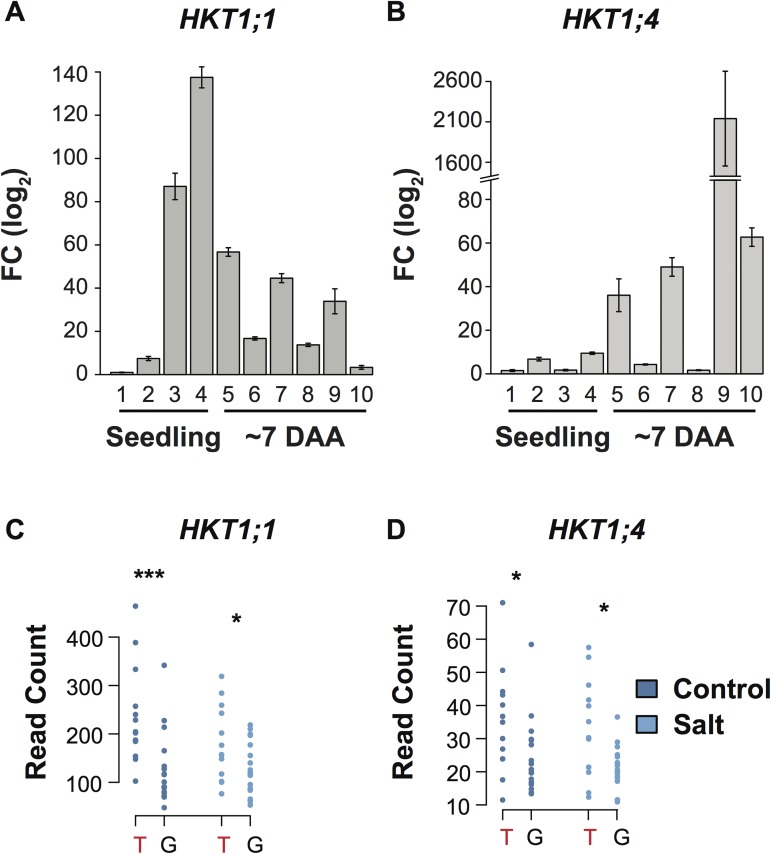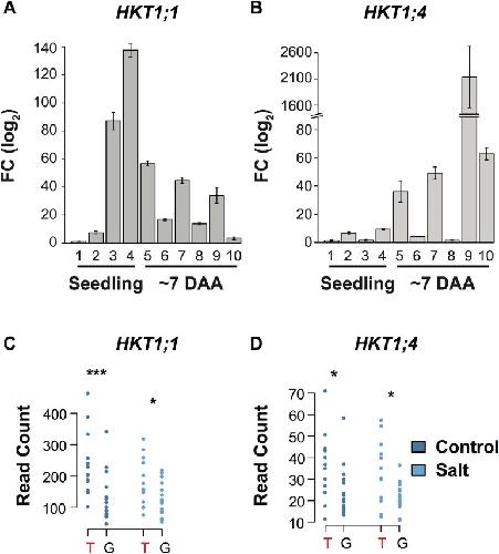 Fig 4. Characterization of HKT1;1 and HKT1;4 expression.Expression profiles of HKT1;1 (A) and HKT1;4 (B) in seeding and mature plants. Numbers below each of the bars indicate different tissues as follows: 1: seedling root, 2: seedling shoot, 3: blade of newest fully expanded leaf in seedling (leaf 3), 4: sheath of newest fully expanded leaf in seedling (leaf 3), 5: penultimate leaf sheath in mature plant, 6: penultimate leaf blade in mature plant, 7: flag leaf sheath in mature plant, 8: flag leaf blade in mature plant, 9: culm of mature plant and 10: panicle of mature plant. DAA: days after anthesis. (C, D) Dot plots comparing the expression of HKT1;1 (C) and HKT1;4 (D) between allelic groups at SNP-4-30535352 in control and saline conditions. The minor allele genotype, which displays higher root Na+ content, is indicated by red text. A Mann-Whitney test was performed within each treatment to determine differences between the two groups with asterisks indicating significance as determined using a one-way ANOVA: ***: p < 0.001; *: p < 0.05.