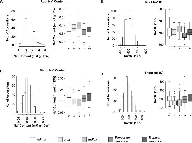 Fig 1. Phenotypic variation and distribution of root and shoot Na+ content and Na+:K+ among the five subpopulations of RDP1.(A) Root Na+ content, (B) root Na+:K+, (C) shoot Na+ content, and (D) shoot Na+:K+. Accessions were assigned to each subpopulation according to Famoso et al [29]. Boxplots with the same letter indicate no significant difference as determined using ANOVA (p < 0.05). Aromatic accessions were excluded from the analysis due to low n.