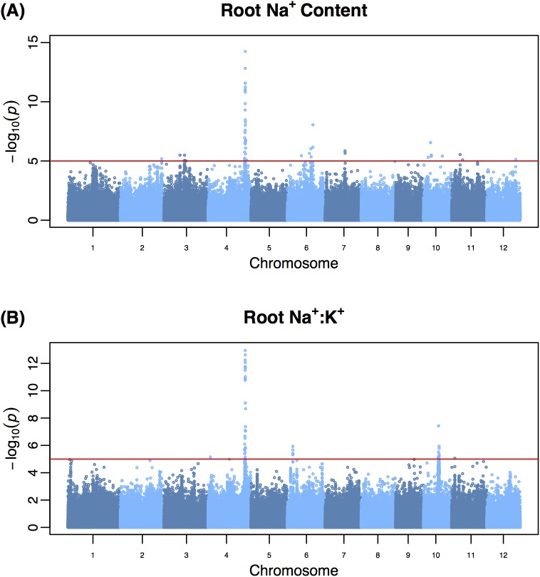 Fig 2. Genome-wide association analysis of Na+ content and Na+:K+ in root tissue.(A) Root Na+ content, (B) root Na+:K+. Genome-wide association (GWA) was performed using a mixed model that accounted for population structure and relatedness between accessions of RDP1 using 365 accessions of RDP1 and 397,812 SNPs. For each trait the least squares mean was used as the dependent variable The red horizontal line indicates a statistical significance threshold of p < 10−5, and was determined using the Meff method with an experiment-wise error rate of 0.05 [63].