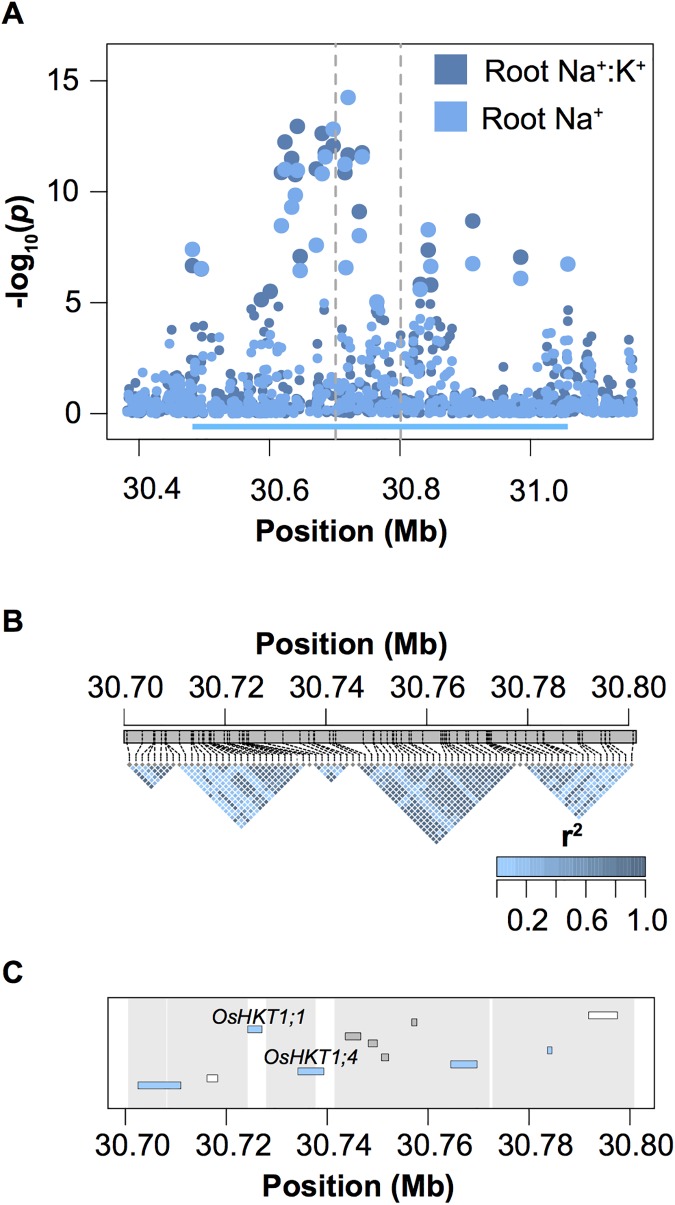 Fig 3. Genetic characterization of RNC4.(A) Regional manhattan plot summarizing GWA analysis of root Na+ and root Na+:K+. The region defining RNC4 is indicated with the cyan bar. (B) LD plots for a subset of five haplotype blocks within RNC4. The vertical broken gray lines in A indicate the region characterized by haplotype blocks. The genes present in this region are illustrated in C. Genes encoding transposable elements are highlighted in the gene track in gray, while those encoding expressed proteins are highlighted in white. The regions defined by each block are indicated in gray.
