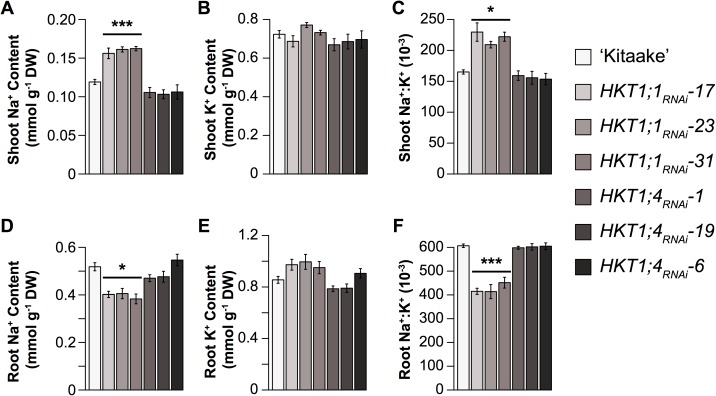 Fig 5. Root (A-C) and shoot (D-F) ion content of HKT1;1 and HKT1;4 RNAi plants. Asterisks indicate significance as determined using Tukey’s HSD: ***: p < 0.001; *: p < 0.05. Pairwise comparisons were made between lines within each treatment. Error bars represent standard error of the mean where n = 12–20 plants.