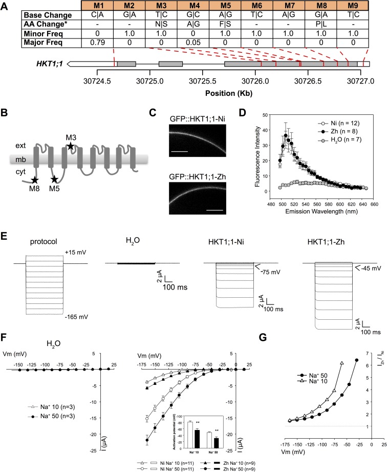 Fig 6. Characterization of high and low root Na+ isoforms of HKT1;1 in Xenopus oocytes.(A) Genetic variants within the ORF of HKT1;1. “Minor Freq” and “Major Freq” indicate the frequency of the alternate allele in the major (n = 19) and minor (n = 13) allelic groups at SNP-4-30535352. “AA change” indicates the resulting changes in protein sequence. Synonymous mutations are indicated by “-”. The grey bars represent exons while the white bars represent the 3’ and 5’ UTRs. (B) Secondary structure of OsHKT1;1 polypeptide showing the position of AA changes, as exemplified between ‘Nipponbare’ and ‘Zhenshan 2’ variants. (C, D) Comparison of OsHKT1;1-Ni and–Zh targeting to the oocyte membrane by confocal imaging of GFP-tagged transporters. (C) Representative images of oocytes expressing Ni (top) or Zh (bottom) transporters. Emitted fluorescence was collected between 505 and 510 nm. Scale bar: 100 μm. (D) Comparison of fluorescence intensity spectra at the membrane in water-injected oocytes (control) and in oocytes expressing either of the HKT1;1 variants. Data are means ± SE. (E) Voltage-clamp protocol and corresponding representative current traces recorded in control oocytes or oocytes expressing the HKT1;1 variants, in 50 mM Na-glutamate-containing bath solution. (F) Current-voltage (I-V) relationships in control oocytes (left) and in HKT1;1-Ni or -Zh-expressing oocytes (right), in either 10 or 50 mM Na-glutamate-containing bath solutions. Data are means ± SE. Insert: Activation potential of HKT1;1-Ni or -Zh currents. Asterisks indicate significant difference in activation potential as determined using Student’s t test: **: p < 0.005. (G) HKT1;1-Zh to HKT1;1-Ni mean current ratio at varying membrane potentials, determined from I-V data shown in (F). Shown data in (E to G) were obtained in a single oocyte batch and are representative of three experiments performed in different oocyte batches.