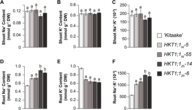 Fig 7. Shoot (A-C) and root (D-F) ion content for HKT1;1 native overexpression lines. Statistical significance was determined using Tukey’s HSD test between each line within treatments. Bars with the same letters indicate no significant difference (p < 0.05). Error bars represent standard error of the mean where n = 12–18 plants.