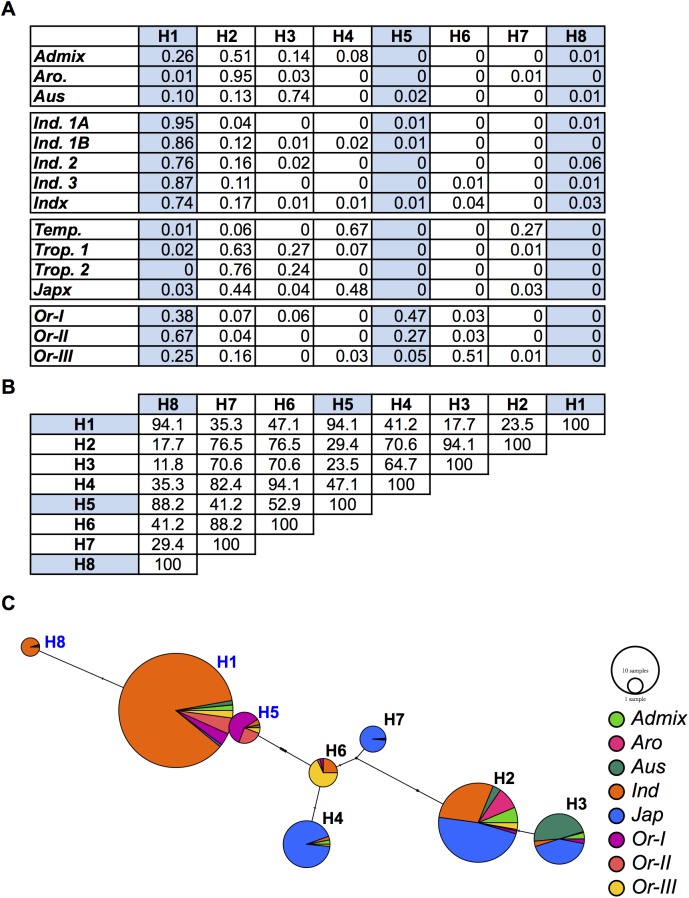 Fig 8. Haplotype analysis of a 37 kb region around HKT1;1 in cultivated and wild rice.(A) Haplotype frequencies in a panel of 3,024 cultivated rice accessions and 446 Oryza rufipogon accessions. (B) Pairwise comparisons of sequence similarities in between the haplotypes in A. High root Na+ haplotypes (i.e. those with the three non-synonymous SNPs are highlighted in blue) (C) Haplotype network for the 37 kb region surrounding HKT1;1. The size of each node is proportional to the number of accessions with the corresponding haplotype. Each node is separated into a pie chart, which indicates the number of accessions for each population with the haplotype. Indica (Ind) accessions are those belonging to Ind 1A, Ind 1B, Ind 2, Ind 3, and Indx. Japonica accessions are those belonging to Temp, Trop 1, Trop 2, and Japx.