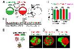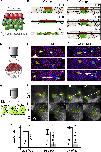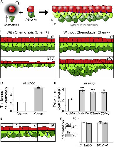 Figure 3. Chemotaxis-Based Radial Intercalation Hypothesis and Computer Simulation(A) Hypothesis: chemotaxis of DCs (green) toward SCs (red) via C3a drives RI and consequent tissue thinning.(B) Computer simulations of the hypothesis showing the initial (0) and final (240) cell configurations with chemotaxis (Chem+) and without chemotaxis (Chem-). Coloring as in Figures 1A and 1B, for visual aid only.(C) Tissue thickness, measured in units of cell diameter after epiboly (20m), is significantly increased in simulations without chemotaxis (n= 30).(D) Invivo tissue thickness, measured in units of cell diameter after epiboly (20m), is significantly higher in embryos with either impaired C3 receptors (C3aRMo, n= 62) or C3 ligands (C3aAb, n= 35; C3Mo, n= 62) compared with control embryos (CoMo).(E) Prediction of bidirectional intercalation. In silico, DCs intercalate both toward the secreting SL, driven by chemotaxis, and against the chemotactic gradient away from the SL, driven by volume exclusion.(F) In silico DC movement toward the SL (Out) is only slightly more frequent than movement away from it (In). Direction of DC intercalation measured in the intercalation assay (exvivo, see Figure2) confirms the model's prediction.Error bars: SD, significance p< 0.01, p< 0.001. See also FigureS6. |