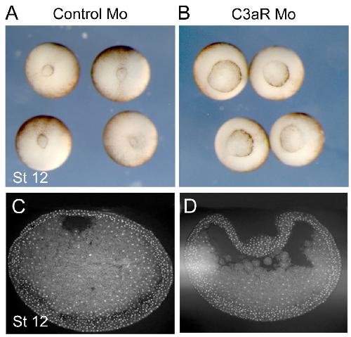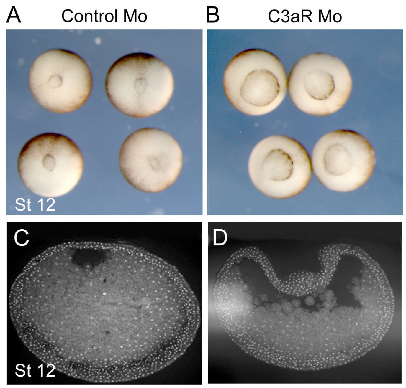 Figure S1. C3aR inhibition affects blastopore closure. Related to Figure 2 Blastopore of representative control (A, CoMo injected) and morphant (B, C3aRMo injected) embryos at stage 12. C3aR inhibition leads to failure of blastopore closure in 68% of the observed n=120 embryos. Internal structure of embryos shown on sections of whole control (C, CoMo) and morphant (D, C3aRMo) embryos. |