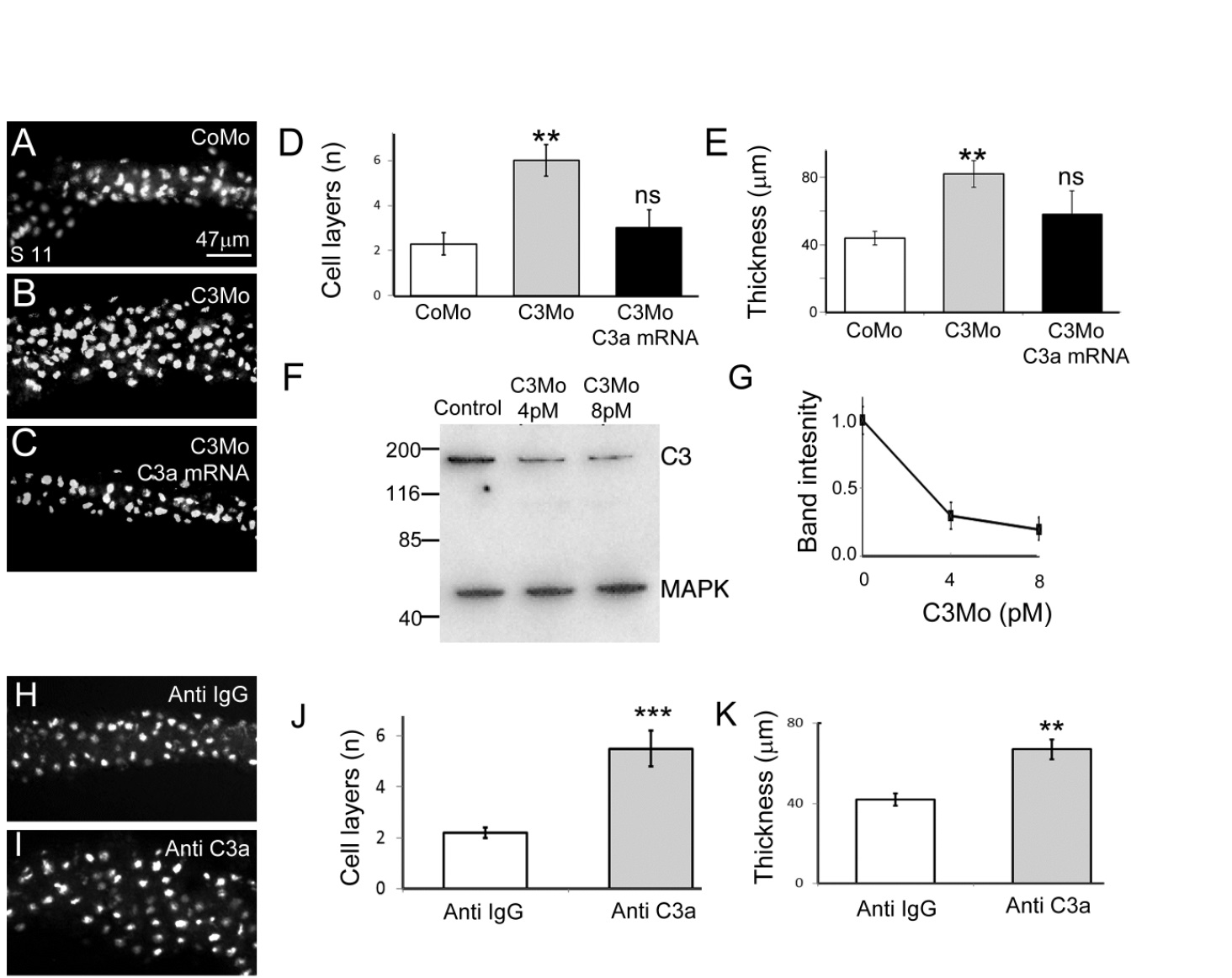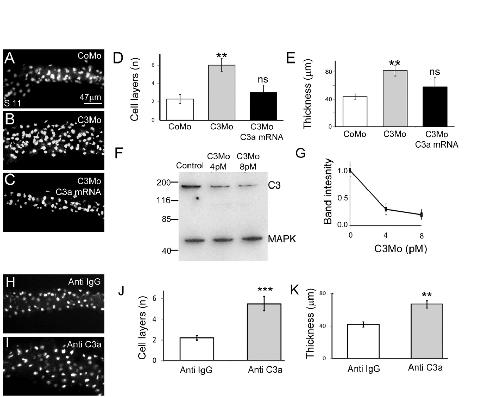 Figure S2. Complement component C3 is required for normal Xenopus epiboly. Related to Figure 2 Sections of the BCR of stage 11 embryos treated with CoMo (A), C3Mo (B), and C3Mo co-injected with rescue C3a mRNA that does not hybridize the C3Mo (C). The number of cell layers (D, n=60 embryos, p<0.01) and tissue thickness (E, n=60 embryos, p<0.01) are both significantly increased in C3 inhibited embryos compared to those in CoMo injected embryos. This effect is rescued by co-injecting C3Mo and C3a mRNA, in which case the difference in number of cell layers and tissue thickness is not significant when compared to those in CoMo injected embryos. This rescue shows the specificity of C3Mo. Western blot of CoMo and C3Mo injected SLs shows the dose-dependent inhibitory effect of the morpholino (F, G). All inhibitory experiments were carried out using 4pM Mo concentrations. (H, I) Sections of BCR of stage 11 embryos injected in the blastocoel cavity with pre-immune anti IgG antibody (H) or a blocking anti C3a antibody (I), previously characterized (Carmona-Fontaine et al., 2011). The number of cell layers (J, n=30 embryos, p<0.005) and tissue thickness (K, n=35 embryos, p<0.01) are both increased in embryos injected with the C3a antibody, but not with the control IgG. Error bars on D, E, G, J and K represent standard deviation. |