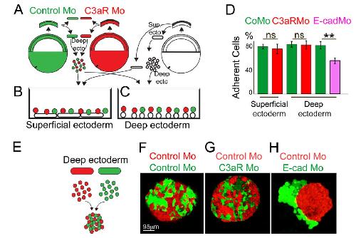 Figure S3. C3aR inhibition does not affect cell-to-cell adhesion. Related to Figure 2 (A-C) Deep ectoderm of stage 10 embryos injected with CoMo (green) or C3aRMo (red) were explanted onto a layer of superficial (B) or deep (C) ectoderm of untreated embryos (white, unlabeled). For positive control, deep ectoderm from CoMo and E-Cadherin Mo (E-cadMo) injected embryos were explanted on untreated deep ectoderm (not shown). After 2h the cultures were washed to remove detached cells and the percentage of variously treated cells remaining on superficial or deep ectoderm was quantified (D, n=80 experiments). No significant difference was observed in the attachment of CoMo and C3aR inhibited cells, however, the difference between control and E-Cadherin inhibited cells is significant (p<0.01, error bars: standard deviation). (E-H) Cell sorting assays of deep ectodermal cells from two different stage 9 embryos were performed on agarose covered dishes. No adhesion difference was observed between cells explanted from CoMo and CoMo (F), or CoMo and C3aR inhibited (G) embryos, while cells originated from CoMo and E-Cadherin embryos clearly sorted (H). |