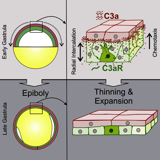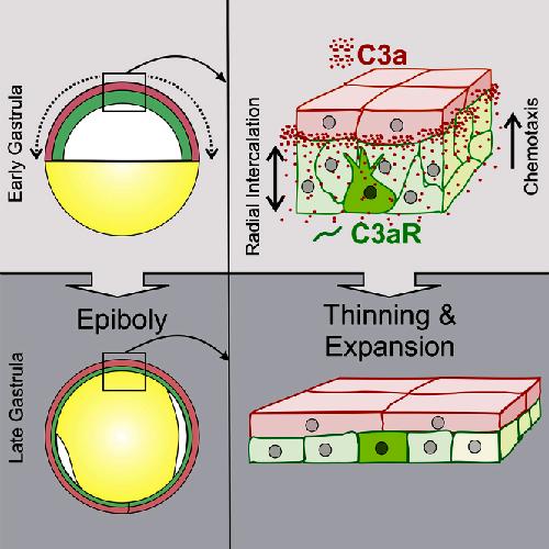 Radial intercalation is a fundamental process responsible for the thinning of multilayered tissues during large-scale morphogenesis; however, its molecular mechanism has remained elusive. Using amphibian epiboly, the thinning and spreading of the animal hemisphere during gastrulation, here we provide evidence that radial intercalation is driven by chemotaxis of cells toward the external layer of the tissue. This role of chemotaxis in tissue spreading and thinning is unlike its typical role associated with large-distance directional movement of cells. We identify the chemoattractant as the complement component C3a, a factor normally linked with the immune system. The mechanism is explored by computational modeling and tested in vivo, ex vivo, and in vitro. This mechanism is robust against fluctuations of chemoattractant levels and expression patterns and explains expansion during epiboly. This study provides insight into the fundamental process of radial intercalation and could be applied to a wide range of morphogenetic events.