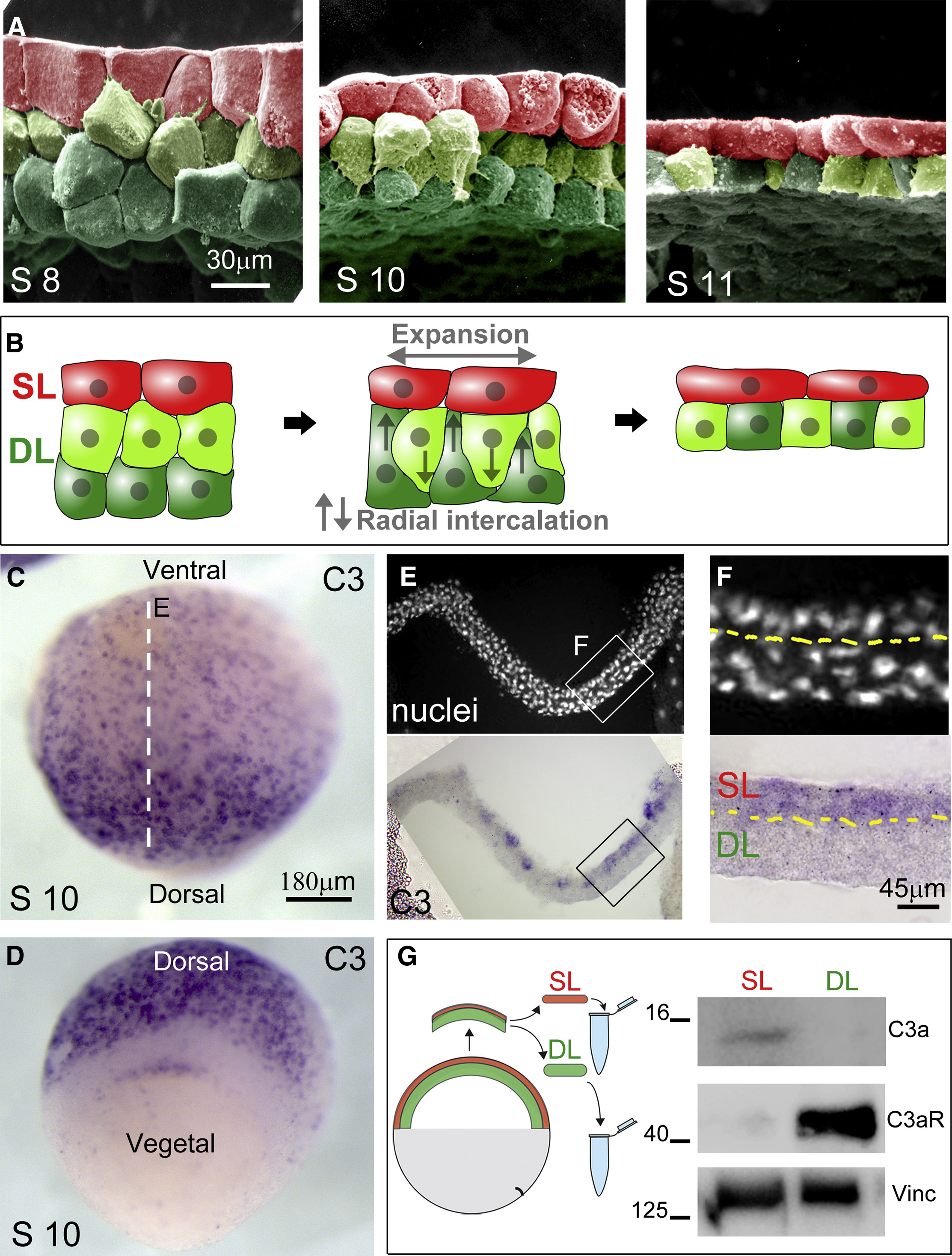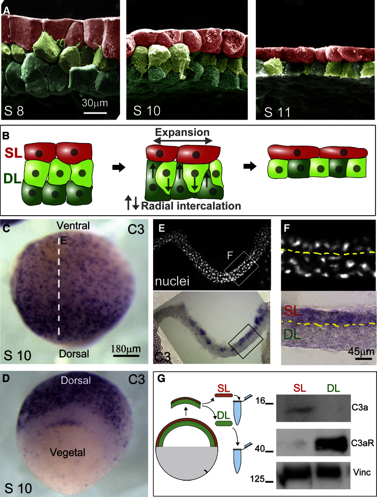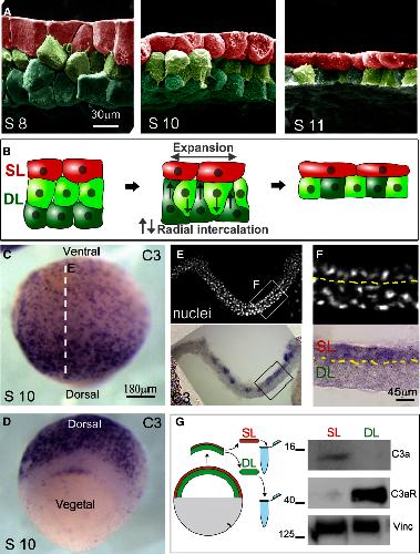 Figure1. Radial Intercalation Is Accompanied by Expression of C3 and C3aR during Xenopus Epiboly(A) SEM images of blastocoel roof during epiboly inXenopus embryos at stages 8, 10, and 11. False coloring indicates superficial cells (red), and the intercalation of outer-deep (light green) and inner-deep (dark-green) cells.(B) Schematic illustration of the process of epiboly in Xenopus shown in (A), including expansion of the superficial layer (SL) and the RI of the deep cell layer (DL). Note that the DL does not intercalate into the SL.(C and D) In situ hybridization (ISH) reveals C3 expression in the animal (C) but not in the vegetal (D) pole region during epiboly.(E and F) Cross-section (E) and zoom (F) of nuclei and ISH along the dashed line indicated in (C) show that C3 is expressed in the SL.(G) Western blot analysis showing differential expression of C3a and C3aR in the SL and DL ofstage 10 embryos, respectively. Loading control, vinculin. |