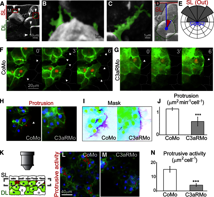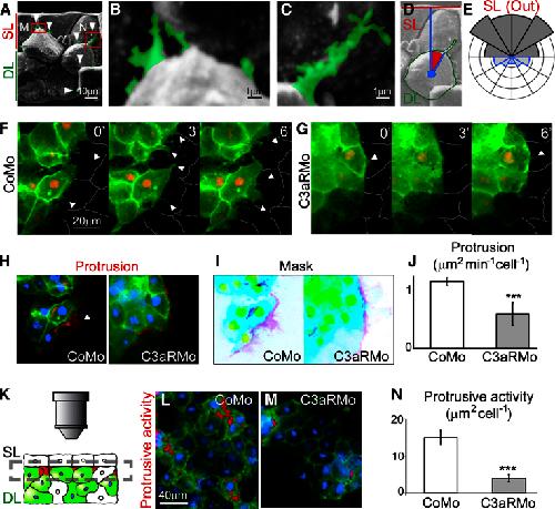 Figure 5. DC Protrusion Analysis(A–E) Direction of DC protrusions in vivo (arrowheads, A–C) was measured in relation to the SL external surface (D) to reveal a bias toward the SL (E, n = 64 embryos, 1445 protrusions).(F and G) Frames from time-lapse imaging showing DC protrusions (arrowheads) ex vivo (see Figure 2D). Protrusions are apparent in the vicinity of the SL in control (CoMo) but not in the C3aRMo-treated explants. Green, membrane; red, nuclei.(H–J) Protrusion activity in the ex vivo assay analyzed using the extension-retraction method. Red shows the difference in membrane signal (green) between frames 3 min apart (H). The difference reveals the extending protrusions (I, purple).(K–N) Ex vivo apical protrusive activity of DCs (L and M: green, membrane; red, protrusion; blue, nuclei) is decreased in C3aR-deficient explants (N: n = 32; ∗∗∗p < 0.01; error, SD). |