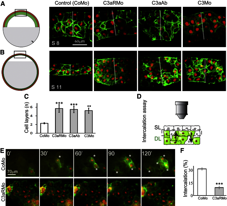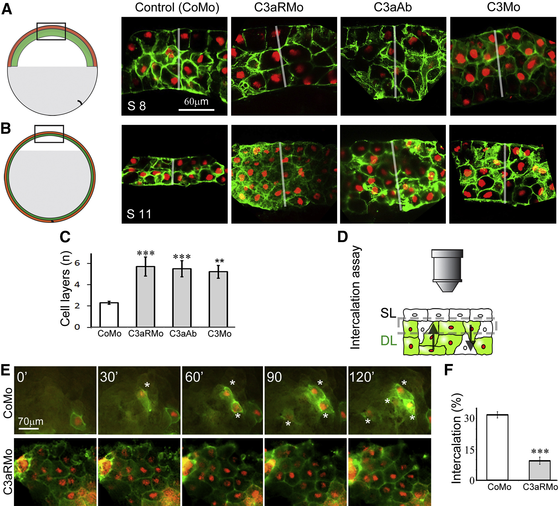 Figure 2. C3 and C3aR Are Required for Radial Intercalation (A and B) Sections showing the blastocoel roof before (A, stage 8) and after (B, stage 11) epiboly incontrol and treated embryos. Embryos deficient inC3aR (C3aRMo), treated with C3a antibody (C3aAb), or suppressed C3 expression (C3Mo) remain thick and multilayered by the end of epiboly (red, nucleus; green, membrane; white bars indicate tissue thickness). In contrast, the tissue thins into a dual-layered epithelium in control (CoMo) embryos. (C) The number of cell layers by the end of epiboly isincreased with C3aRMo (n= 62), C3a antibody (C3aAb; n= 30), or C3Mo (n= 60) when compared with control embryos, indicating the lack of RI in the absence of C3 signaling.(D) Schematic of the exvivo intercalation assay showing the explant from the side. A dashed rectangle indicates the focal range of imaging, which includes the top region of the DL that is in close vicinity of the SL. (E) Frames from time-lapse recording in the exvivo assay show intercalating DCs () in a control (CoMo) and C3aR-deficient (C3aRMo) tissue explants. (F) The number of DCs that intercalate is significantly lower in C3aRMo tissues than in control tissues, showing that intercalation is hampered in the absence of C3aR signaling.Data are represented as means SD, t-test significances are p< 0.001, p< 0.01. See also Figures S1-S5. |