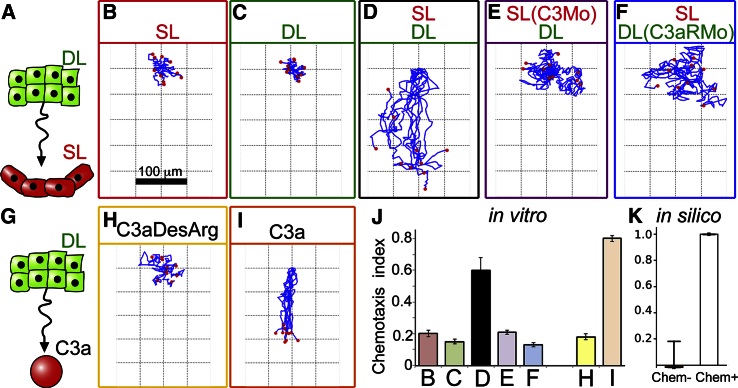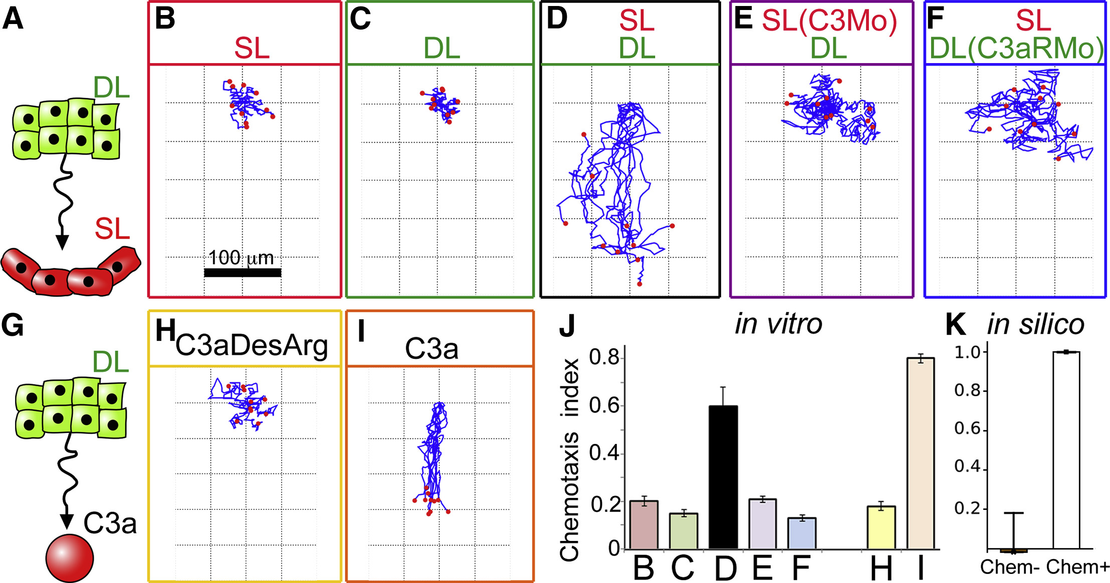 Figure 4. C3a-Based Chemotaxis between Cells of the Deep and Superficial Layers(AK) Testing the basic assumption of the model. Classical chemotaxis assay using DL and SL explants (A), or DL explants with purified C3a protein (G). Trajectories of SL (B) and DL (CF, H, and I) explants, and DL chemotaxis toward non-functional (C3aDesArg, H, n= 35) and functional (I, n= 38) C3a source with corresponding chemotaxis indices invitro (J) and insilico (K). Error bars: SD. See also Figure S6. |
