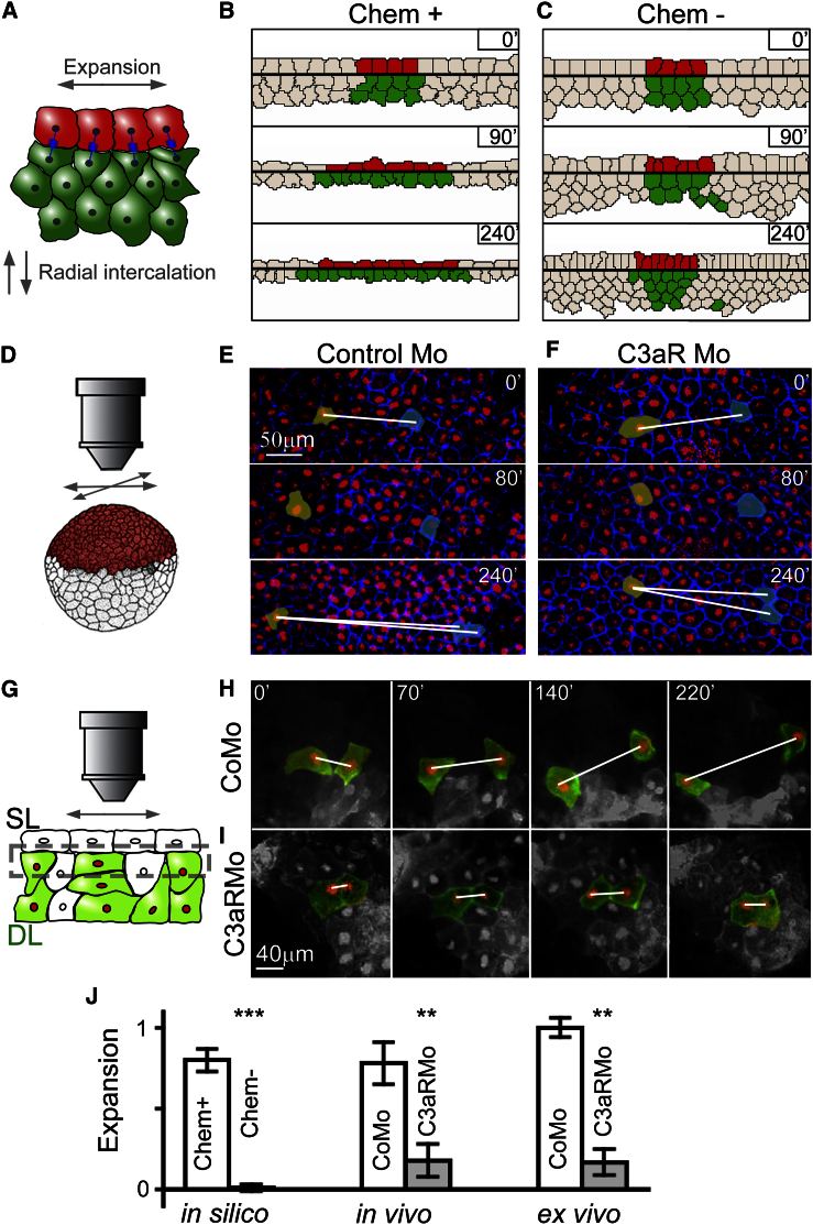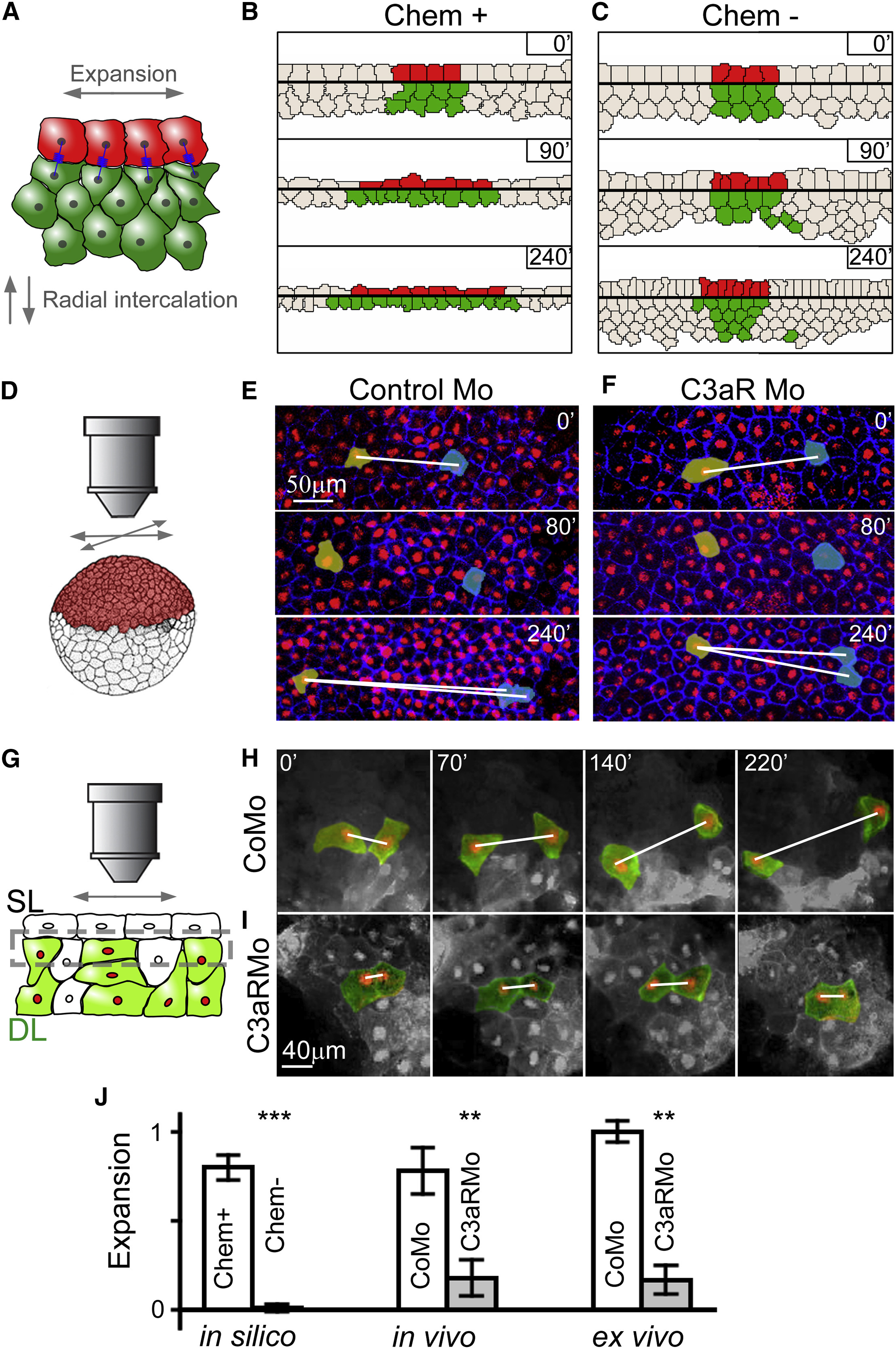 Figure6. C3 Signaling Is Required for Epithelial Expansion(AC) Model prediction of tissue expansion as a consequence of chemotaxis-driven RI. In the presence of chemotaxis, both the SL and DL expand simultaneously with RI (B, coloring for visual aid only), while no expansion is observed without chemotaxis (C).(DF) Time-lapse imaging of epiboly in live embryos (D) reveals that while SCs drift away from one another following CoMo treatment (E), the distance of SCs in C3aR-deficient embryos does not increase (F) during the process.(GI) Exvivo study of tissue expansion using the intercalation assay (G). Cells in the DL separate as the isolated tissue undergoes expansion (H). This expansion is lost in tissues lacking C3aR (I).(J) Quantification of tissue expansions as the difference in the final and initial distances relative to the initial distance of tracked cell pairs insilico, invivo, and exvivo. Error, SD; significance, p 0.01, p< 0.001. See also FigureS7. |