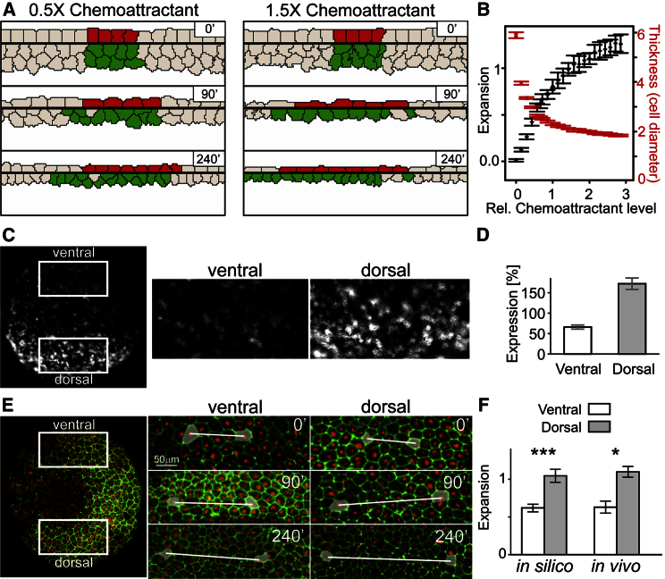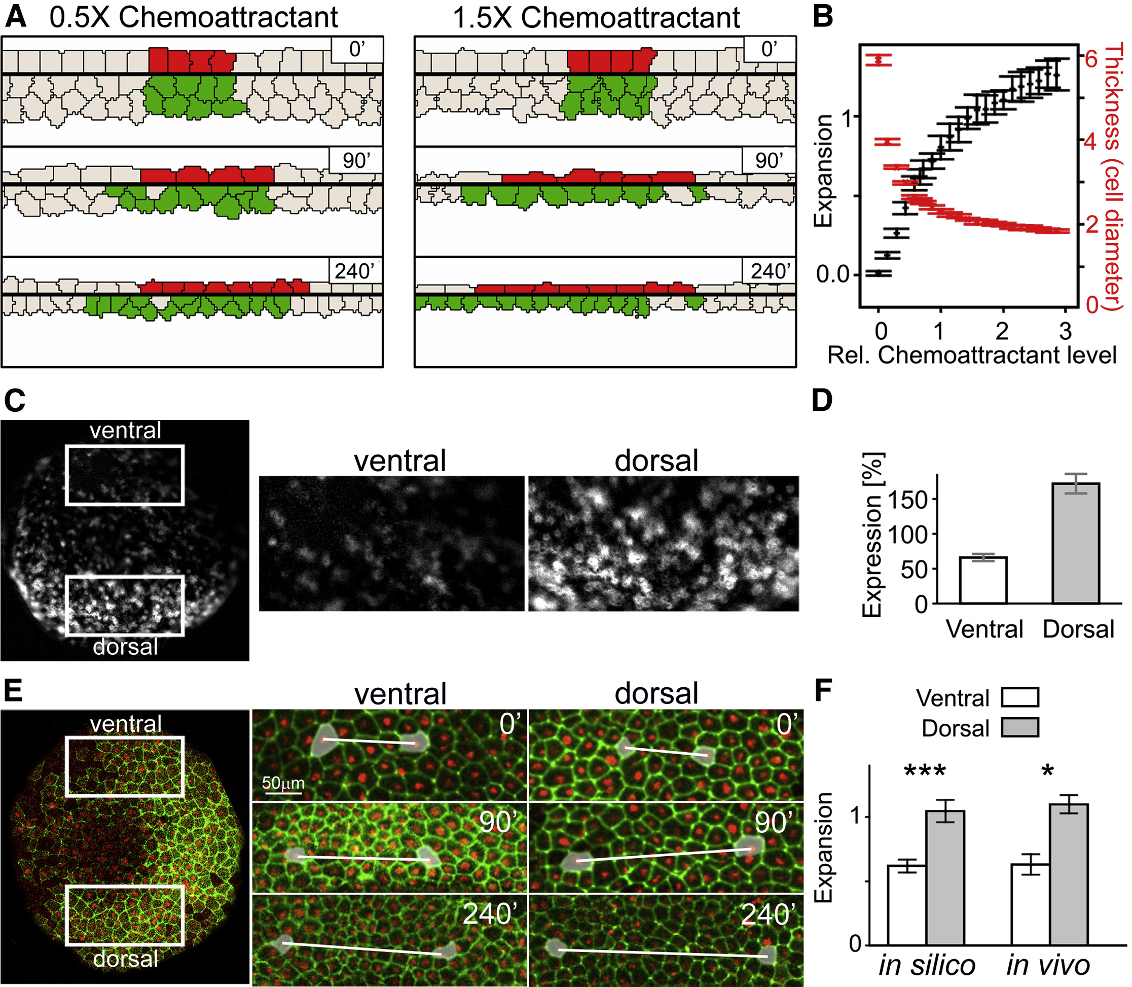 Figure7. Dorsoventral Differences in Expansion Explained by Differential C3 Expression(A) The extent of thinning and expansion depends on the level of chemoattractant in the SL insilico.(B) Tissue expansion and thickness shown after 4hr in simulations as a function of chemoattractant levels.(C and D) Approximation of C3 levels invivo using intensity levels from ISH of a stage 10 embryo reveals differential expression in the animal cap with a reduced level in the ventral region (66% compared with the whole-animal cap) and an increased level in the dorsal region (172%).(E and F) Expansion invivo in the ventral and dorsal areas of the animal pole. Expansion in the dorsal regions was significantly higher (n= 20) than in the ventral regions, as predicted by the model. Error bars in (B) and (F) show the SD; error bars in (D) show uncertainty of sampling. Significance p< 0.001, p< 0.05. |