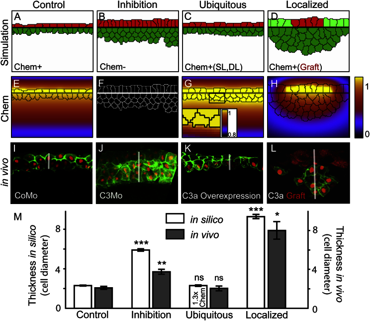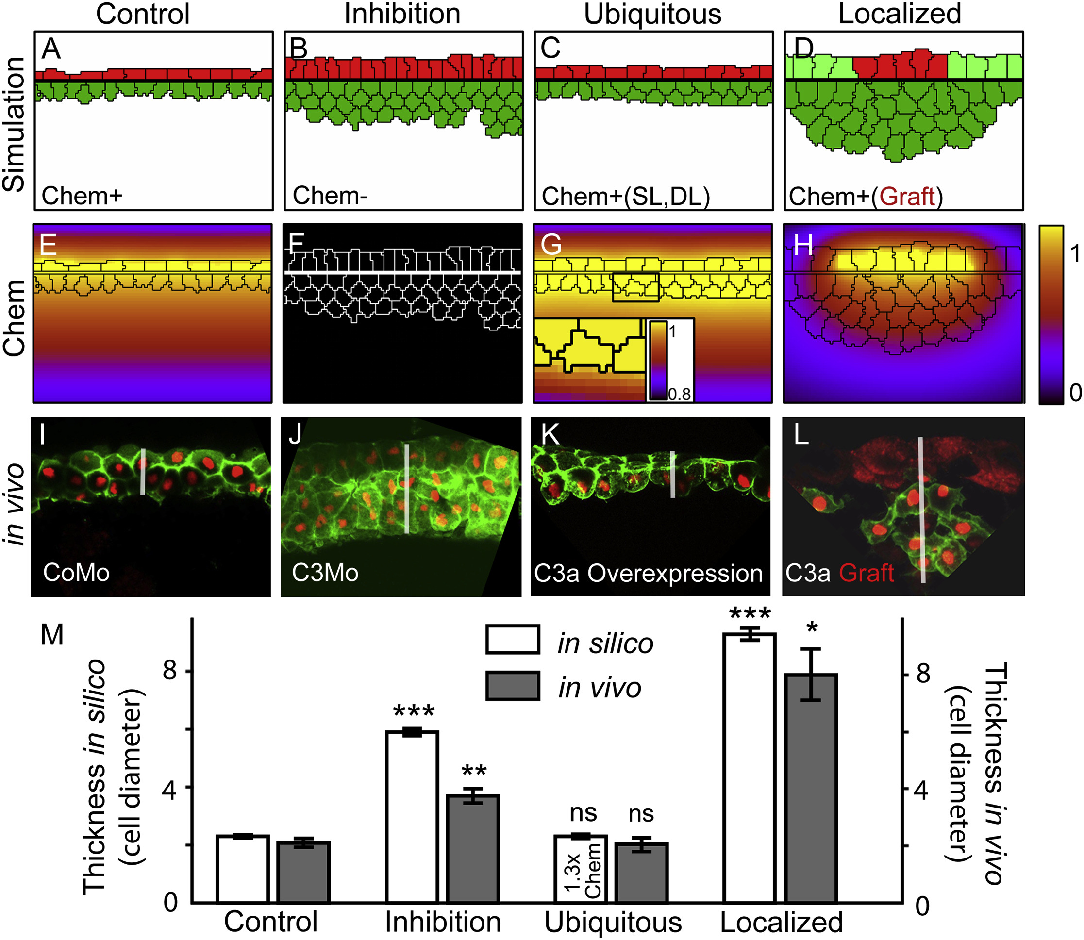 Figure 8. Localization of Chemoattractant Source Determines Radial Intercalation(A–H) Simulated cell configurations and corresponding chemoattractant levels at the end of epiboly with different localizations of chemoattractant production: only in the SL (Control, A, E), nowhere (Inhibition, B, F), in every cell (Ubiquitous, C, G), and in a restricted region of the SL (Localized, D, H, producing region shown in red).(I–L) Experimental validation of the predicted behavior showing sections of the blastocoel roof of stage 11 embryos. Red, nucleus; green, membrane; graft in (L) marked with cytosolic RLDx. White bar indicates tissue thickness.(M) Quantification of tissue thickness, measured in units of cell diameter after normal epiboly (20 μm), for the four settings in silico and in vivo. Error, SD. Significances compared with relevant control: ∗p < 0.05, ∗∗p < 0.01, ∗∗∗p < 0.001; ns, p > 0.05. 1.3× Chem denotes 1.3-fold overexpression in both DCs and SCs. |