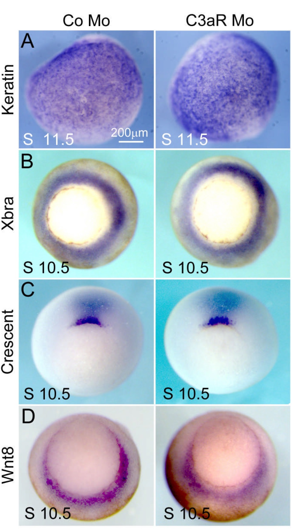 Figure S5. Ectoderm and mesoderm specification is not affected by C3aR inhibition. Related to Figure 2 (A) Keratin expression in the animal pole at stage 11.5 is normal in C3aRMo injected embryos, indicating the normal specification of the ectoderm (ISH, animal view). (B-D) Mesodermal markers Brachyury (Xbra), Crescent, and Wnt8 at stage 10.5 are unaffected by C3aR inhibition (ISH, vegetal view). |