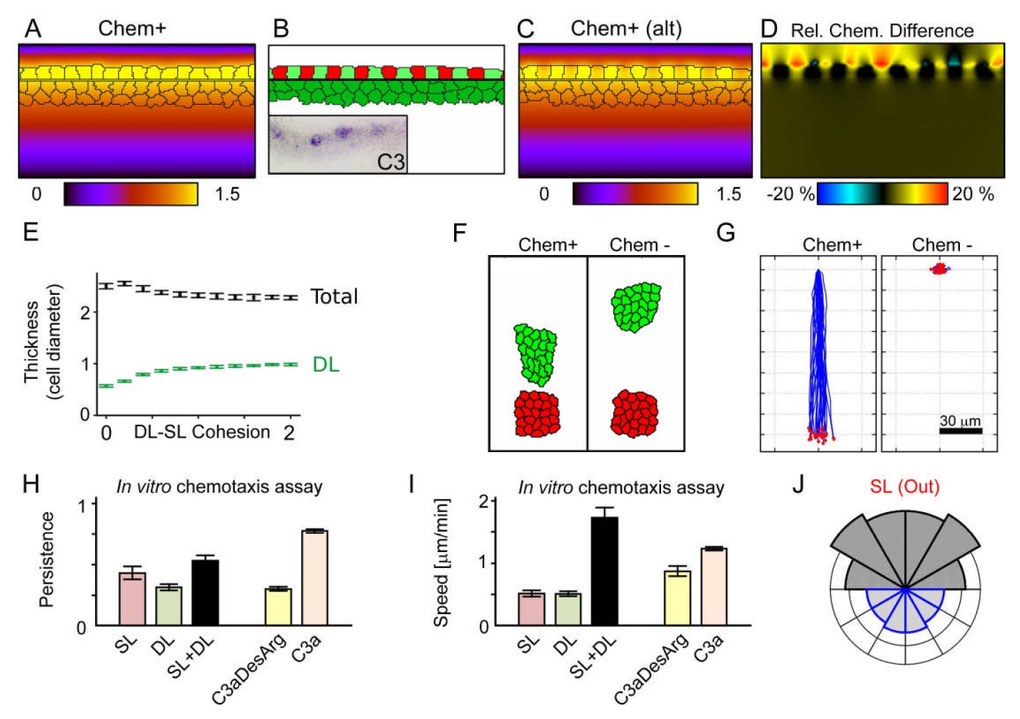 Figure 4. C3a-Based Chemotaxis between Cells of the Deep and Superficial Layers(A–K) Testing the basic assumption of the model. Classical chemotaxis assay using DL and SL explants (A), or DL explants with purified C3a protein (G). Trajectories of SL (B) and DL (C–F, H, and I) explants, and DL chemotaxis toward non-functional (C3aDesArg, H, n = 35) and functional (I, n = 38) C3a source with corresponding chemotaxis indices in vitro (J) and in silico (K). Error bars: SD. See also Figure S6. |