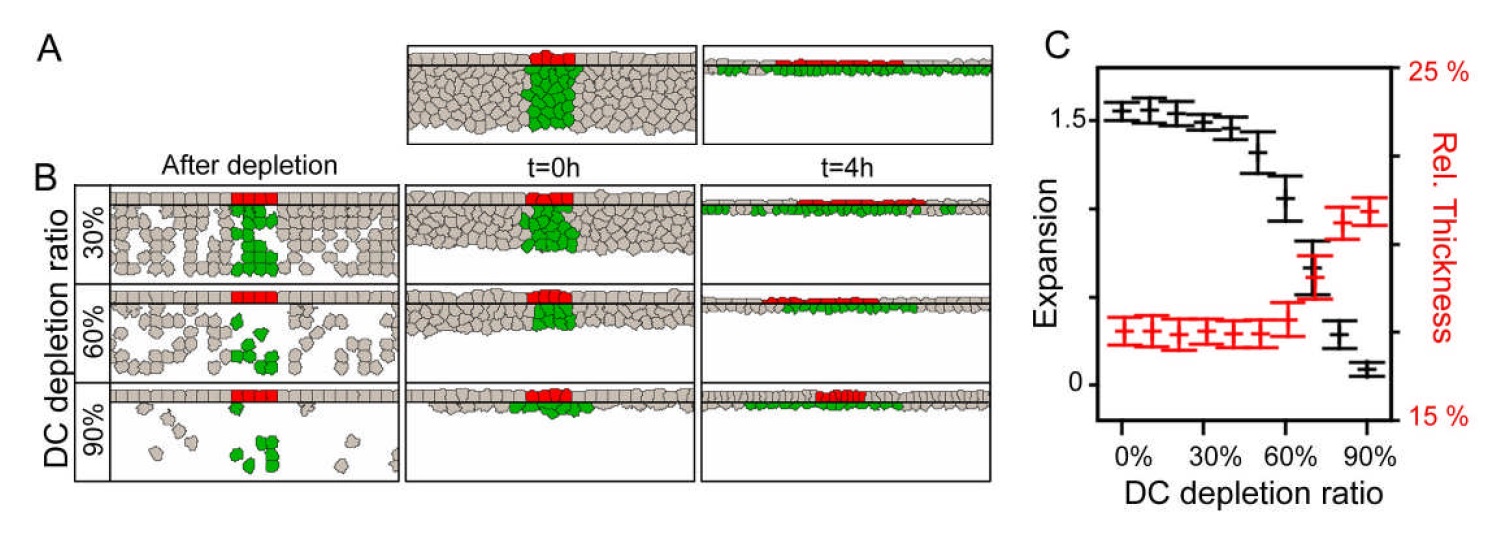 Figure S7. Model behavior after changing the number of cell layers. Related to Figure 6 (A) Configurations from a sample simulation run with 6 layers of DCs showing that the model reproduces epiboly in systems with more than 2 layers of DCs, as in zebrafish. (B) Simulations initiated with 6 layers of DCs, after which a given percentage of the DC population (DC depletion ratio) is removed. The resultant holes are filled by the DCs condensing in the vicinity of the SL. The proposed chemotaxis-based mechanism in simulations with a large number of DCs produces effective expansion of the tissue. Expansion is hampered only when the number of DC layers falls below two. (C) SL expansion and relative tissue thickness in simulations run with different ratio of DCs depleted from the initial 6 layers of DCs (see panels I and J). Thickness is relative to the initial tissue thickness (before depletion). Even when the majority of the DCs are depleted from the simulation, expansion is still observed due to the local expansion transmitted to the SL. N=30 independent simulations per condition, error: standard deviation. |