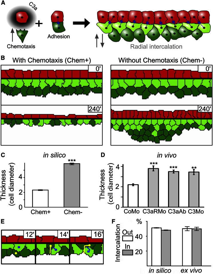 Figure 3. Chemotaxis-Based Radial Intercalation Hypothesis and Computer Simulation(A) Hypothesis: chemotaxis of DCs (green) toward SCs (red) via C3a drives RI and consequent tissue thinning.(B) Computer simulations of the hypothesis showing the initial (0′) and final (240′) cell configurations with chemotaxis (Chem+) and without chemotaxis (Chem-). Coloring as in Figures 1A and 1B, for visual aid only.(C) Tissue thickness, measured in units of cell diameter after epiboly (20 μm), is significantly increased in simulations without chemotaxis (n = 30).(D) In vivo tissue thickness, measured in units of cell diameter after epiboly (20 μm), is significantly higher in embryos with either impaired C3 receptors (C3aRMo, n = 62) or C3 ligands (C3aAb, n = 35; C3Mo, n = 62) compared with control embryos (CoMo).(E) Prediction of bidirectional intercalation. In silico, DCs intercalate both toward the secreting SL, driven by chemotaxis, and against the chemotactic gradient away from the SL, driven by volume exclusion.(F) In silico DC movement toward the SL (Out) is only slightly more frequent than movement away from it (In). Direction of DC intercalation measured in the intercalation assay (ex vivo, see Figure 2) confirms the model's prediction.Error bars: SD, significance ∗∗p < 0.01, ∗∗∗p < 0.001. See also Figure S6. |