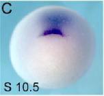 c3 (complement 3) gene expression in X. laevis embryo, assayed via in situ hybridization at NF stage 10, C ventral up and dorsal down; D blastopore/vegetal view with dorsal up. iews. |