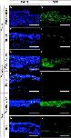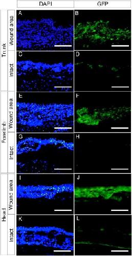 The prx1 enhancer was activated in all trunk, forelimb, and head-skin wound areas 4 days after skin excision in Mprx1-GFP froglets. Sections of regenerating and intact control skin were labeled with an anti-GFP antibody; nuclei were stained with DAPI. Immunostaining of regenerating skin around the original wound area (A,B,E,F,I,J) and intact (control) skin away from the wound area (C,D,G,H,K,L) in the same froglet. Little GFP was detected in the intact control skin (D,H,L), but robust staining for GFP was detected under the wound epidermis (B,F,J). Skin surface is up. Five of five and four of four individuals showed basically the same results in the trunk and forelimb, respectively. Two of four individuals showed robust staining for GFP in wound area of the head (J), but the rest showed relatively weaker staining for GFP. Bar = 100 µm.