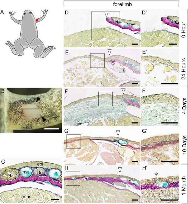 Forelimb-skin regeneration and wound healing after excision. A: Illustration of a metamorphosed froglet; the red rectangle shows the location for skin excision. B: The skin wound immediately after excision. C: Intact forelimb skin stained with Elastica van Gieson and Alcian blue. Epi, epidermis; der, dermis; mg, mucous gland; sg, serous gland; mus, muscle (n = 1). D'–H': Magnified views of the rectangles in D–H. Time after incision: D,D', 0 hr (immediately after skin excision) (n = 2); E,E', 24 hr (n = 4), F,F', 4 days (n = 4), G,G', 10 days (n = 5); H,H', 1 month after excision (n = 4). Black arrowheads (B) indicate the wound site. Open arrowheads (D–H) indicate the right-hand border of the wound. Asterisk (H') indicates an exocrine gland duct. B: Bar = 1 mm. C–H, D'–H': Bar = 50 µm.