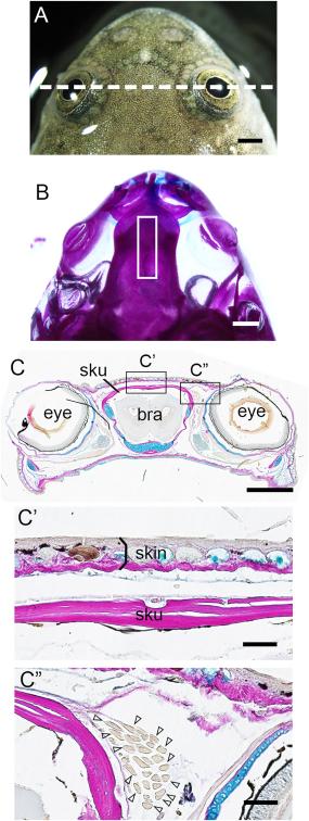 Medial head skin overlies bone, not muscle. A: Brightfield view of the rostral portion of a Xenopus laevis froglet. B: Whole-mount bone staining of a froglet with Alizarin red. C: The head region was stained with Elastica van Gieson and Alcian blue and sectioned through the plane indicated by the dotted line in A. Bra, brain; sku, skull. C',C”: Magnified views of the rectangles in C. The white rectangle in B indicates the medial-dorsal area of the head where the overlying skin was excised in Fig. 1. No subcutaneous muscles were observed in the medial head area C'. Open arrowheads (C”) enclose ocular muscles. A–C: Bar = 1 mm. C',C”: Bar = 100 µm.