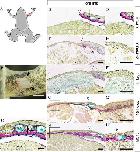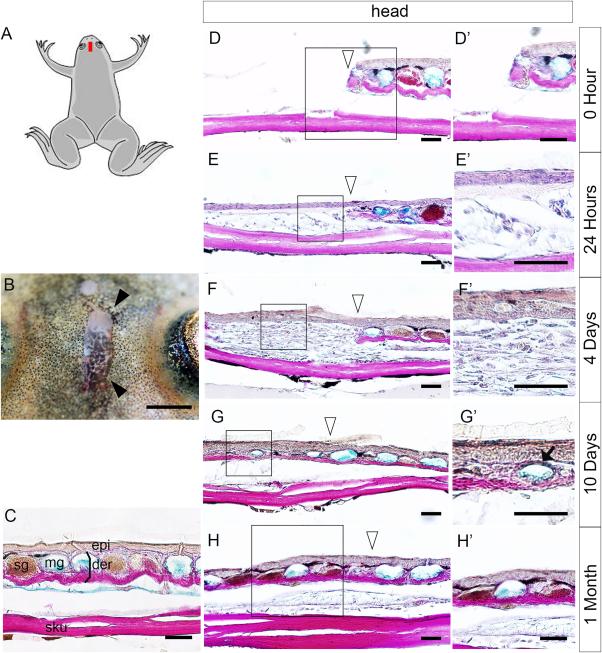 Head-skin regeneration and wound healing after excision. A: Illustration of a metamorphosed froglet; the red rectangle shows the excision location. B: The skin wound immediately after excision. C: A section of intact head skin, stained with Elastica van Gieson and Alcian blue. Epi, epidermis; der, dermis; mg, mucous gland; sg, serous gland; sku, skull (n = 4). D'–H': Magnified views of the rectangles in D–H. Time after excision: D, D', 0 hr (immediately after excision) (n = 3); E,E', 24 hr (n = 5); F,F', 4 days (n = 5); G,G', 10 days (n = 5); H,H', 1 month after excision (n = 4). Black arrowheads (B) indicate the wound site. Open arrowheads (D–H) indicate the right-hand border of the wound. Black arrow (G') indicates maturing secretion gland. B: Bar = 1 mm. C–H, D'–H': Bar = 50 µm.
