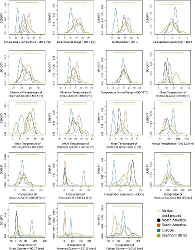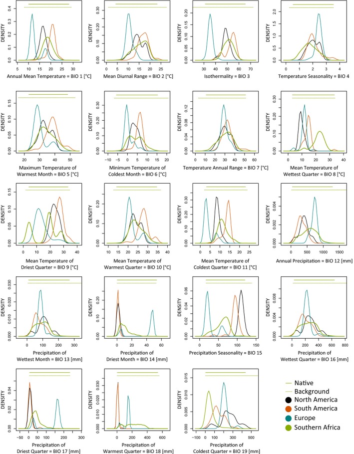 Figure 1. Density profiles for all environmental variables. Background conditions were extracted within a 200‐km buffer enclosing the native species records.