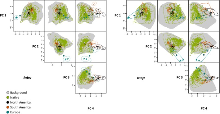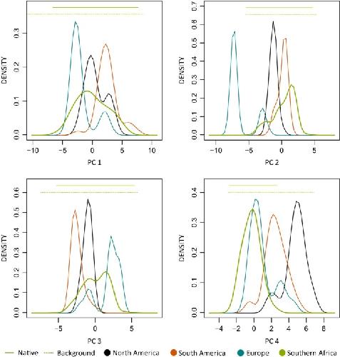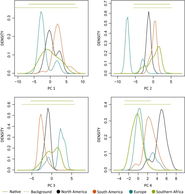 Figure 2. Density plots for the four principal components with Eigenvalues >1. Background conditions were extracted within a 200‐km buffer enclosing the native species records. See Table 1 for details