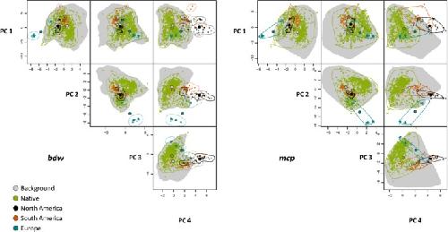 Figure 3. Four dimensional hypervolumes of the environmental niches of Xenopus laevis as well as for the potential niche within its native distribution characterizing its available climate space.